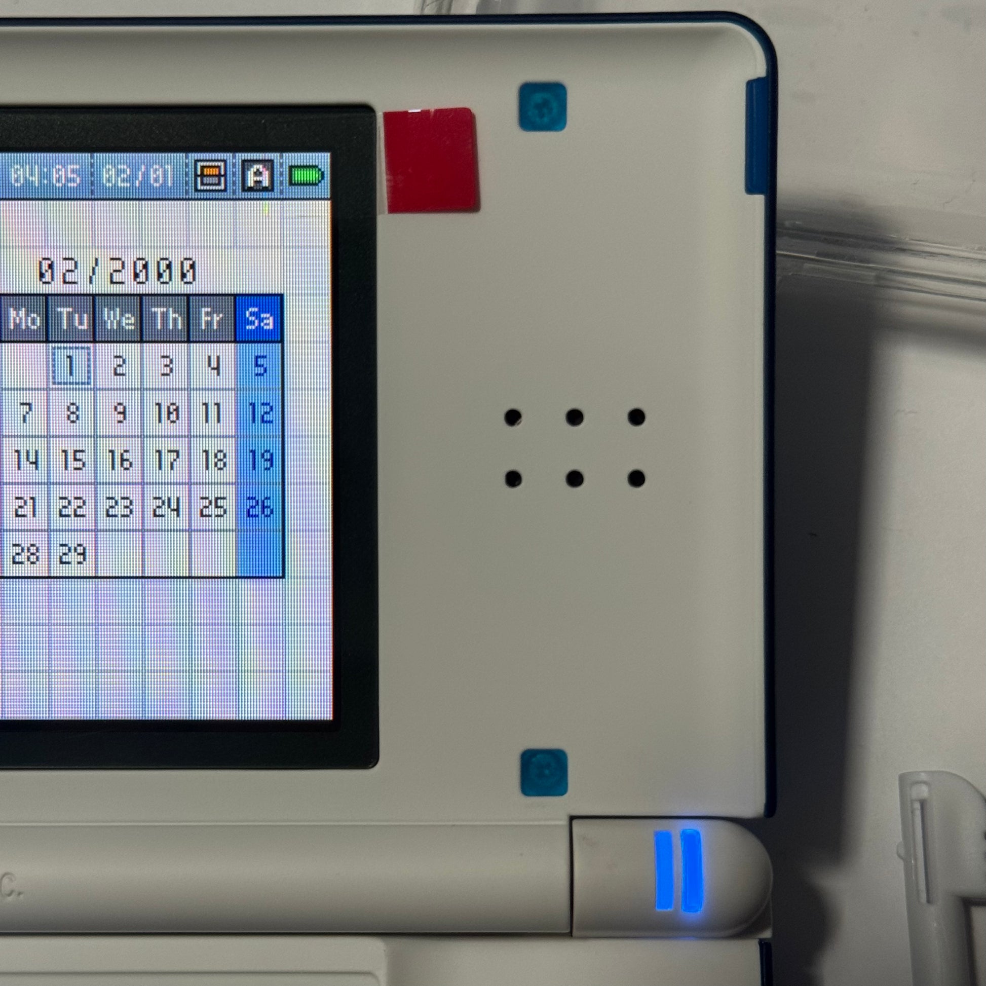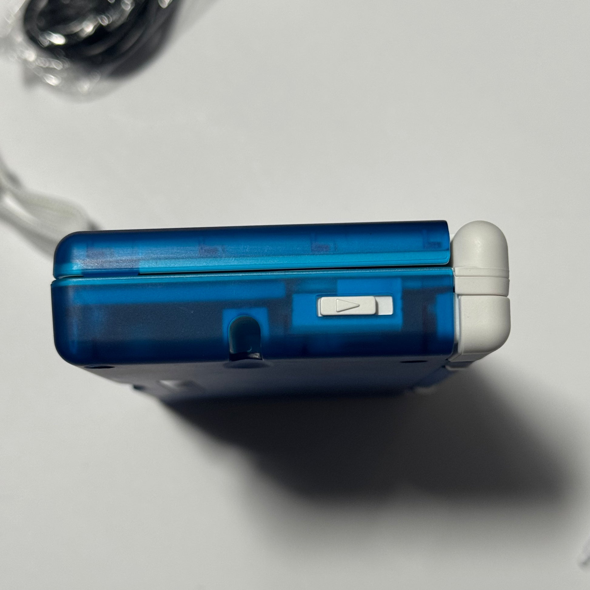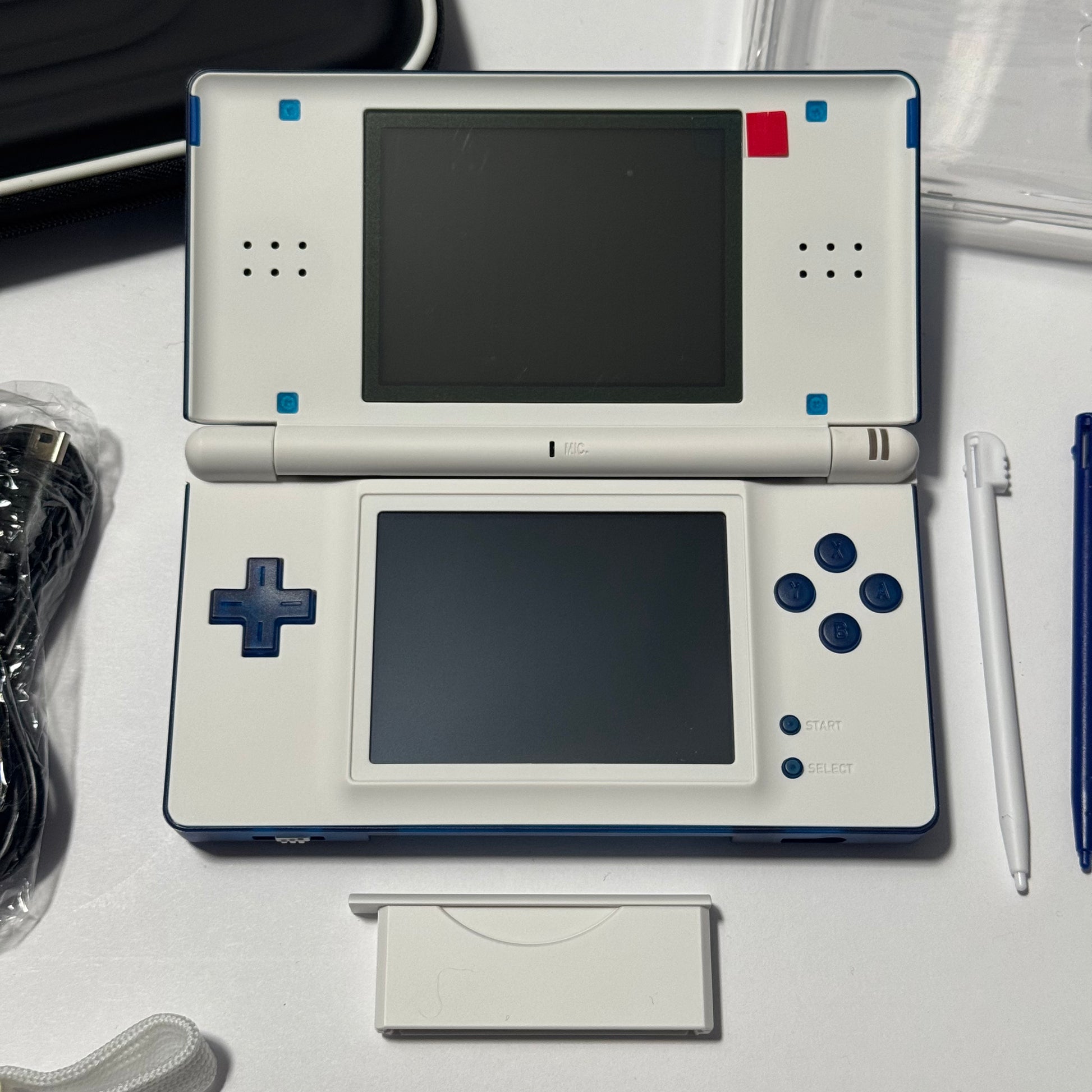 This bundle includes a brand new clear shell to put over the console, a USB charger, a white adjustable wrist strap, a matching white Extreme Rate stylus and GBA slot cover, a brand new bule stylus, and a brand new carrying case that fits all of the above, and the DS! The main power LED is blue, the low power LED is white.