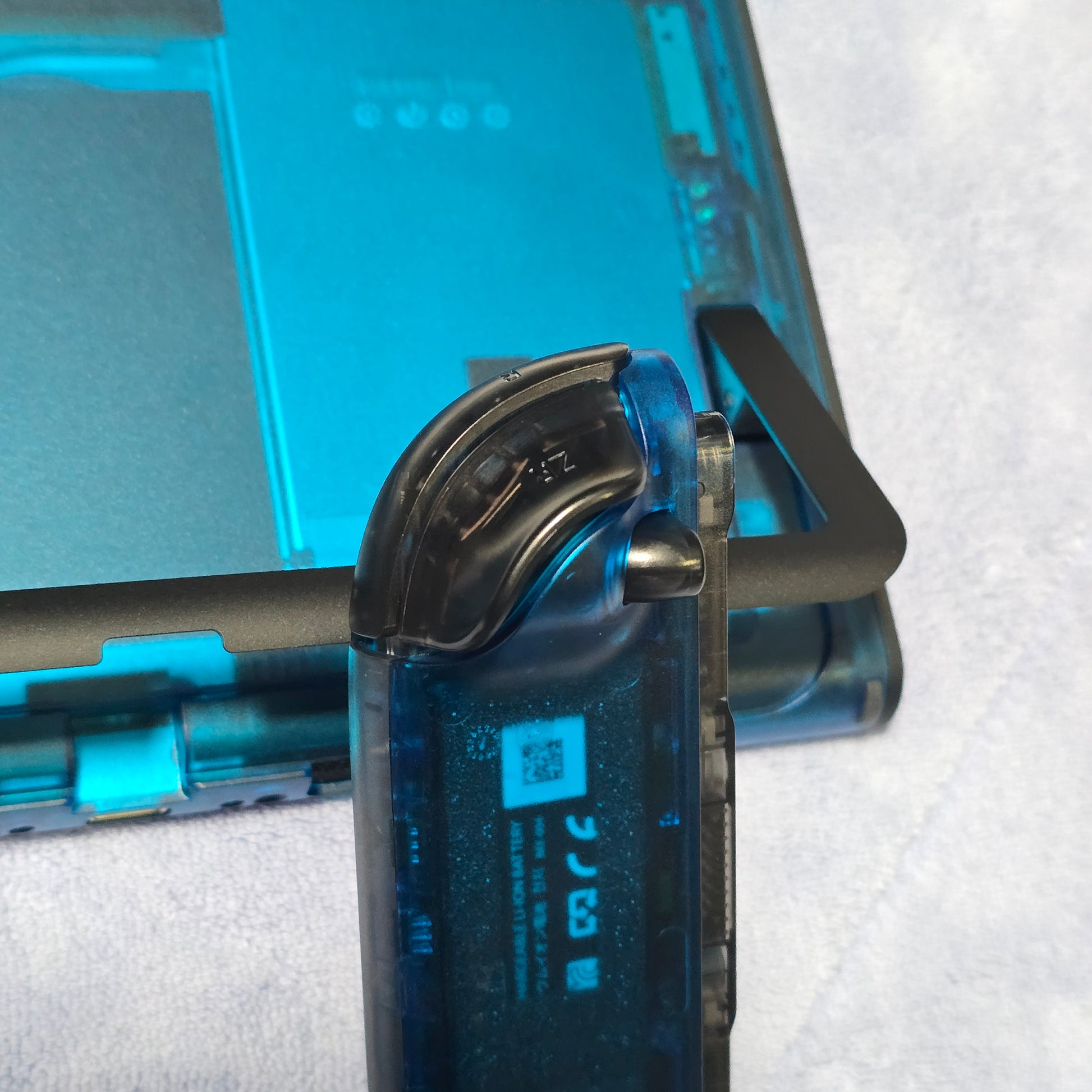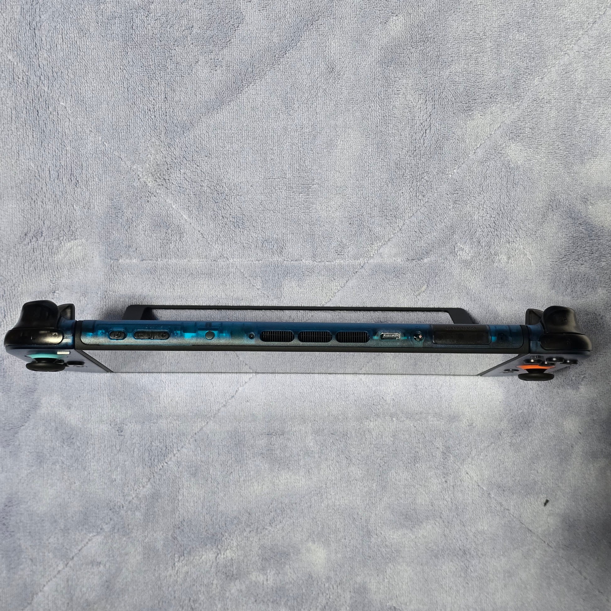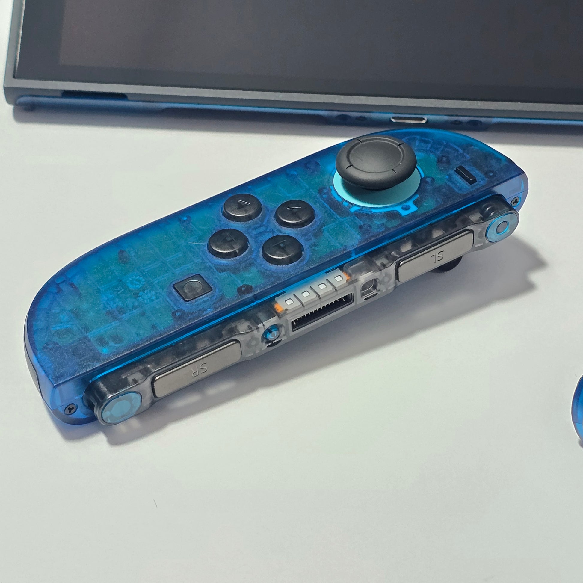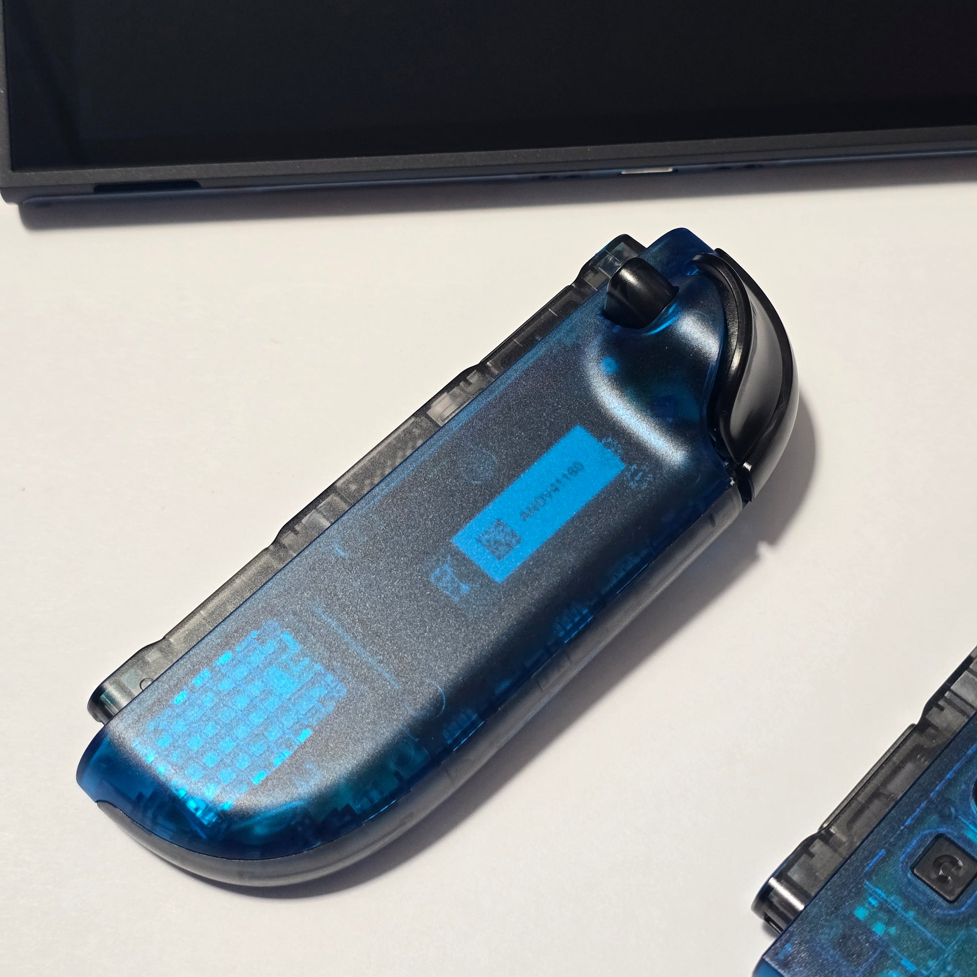 This console is custom built out of 2 Extreme Rate shells; clear blue, and clear black. The main pieces are clear blue, while all of the buttons and inner pieces are clear black.